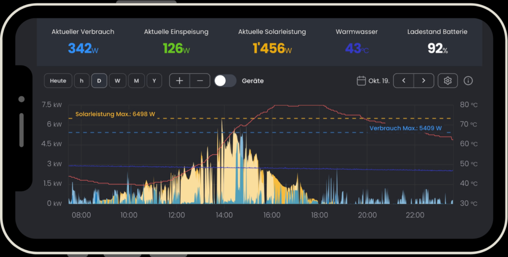L’ensemble du système est piloté par le SolarManager, qui permet une coordination parfaite entre le photovoltaïque, le stockage sur batterie, la borne de recharge pour véhicule électrique et la pompe à chaleur. L’électricité solaire excédentaire est stockée, utilisée pour la recharge du véhicule électrique ou directement employée pour le fonctionnement de la pompe à chaleur.