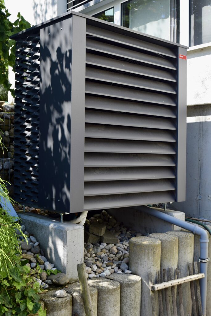 L’installation solaire est complétée par une pompe à chaleur air/eau installée à l’extérieur, qui assure un chauffage fiable et efficace du bâtiment. Cette pompe à chaleur exploite de manière optimale l’énergie renouvelable et garantit un confort thermique élevé pour une consommation d’énergie minimale.